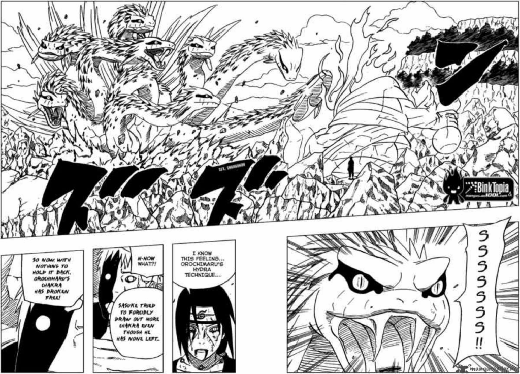 No mangá, esta manifestação aparece durante a batalha entre Sasuke e Itachi, quando Orochimaru surge do Selo Amaldiçoado de Sasuke em sua forma de hidra de oito cabeças.